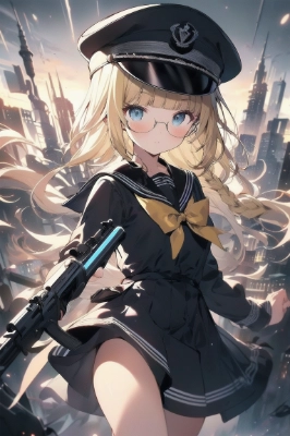 (((Wrap a Brown Plaid shawl scarf))),(((Light brown hair))),Sharp eyes,Dark sailor dress,(((bunches))),((twin tail hair)), ((head gear)), (((gun))), (((Dark peaked cap))),(magical girl), official art,high quality,production art,novel illustration,best,high resolution,best quality,award winning,highly detailed,masterpiece,by famous artist,hyper extreme detailed, near future city,,