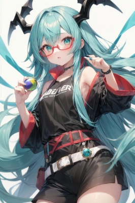 masterpiece, best quality, extremely detailed, anime, young woman, turquoise-blue hair, red glasses, long-length hair, horse girl, racing, racetrack, determined expression, galloping, dynamic pose, tail, hooves, competition,