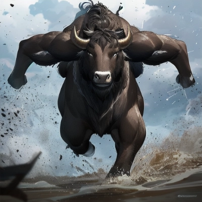 (a line of determined bulls charges forward in unison, their powerful muscles rippling beneath sleek fur),