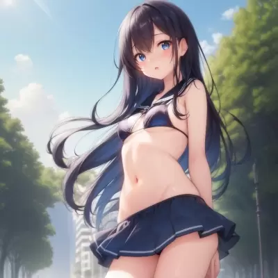 ((masterpiece)), ((illustration)), ((best quality)), ((highres)), ((wallpaper)), 1girl long straight black hair, blue eyes, swimsuit, ((bikini)), bra, [sailor uniform], mini skirt, loafer, kneehighs, in street trees, standing, blue sky, building, cute, kawaii, horizontal