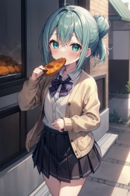 wink, masterpiece, best quality, highres, 1otoko no ko, yellow cardigan, (brown pleated skirt), newsboy hat, かわいい, flat chest, aqua hair, aqua eyes, half updo, smile, (camera:1.3), one eye closed, take a photo<lora:flat2:0> <lora:hairdetailer:0.5>,,,,,