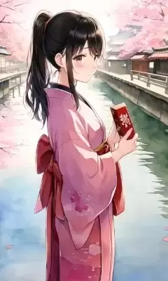 Masterpiece,(Taisho Romantic)+,(face in profile)+,(I won\'t look at you)++,(long ebi brown hakama skirt)++, (Japanese Akane coloured Yagasuri pattern)+, black laced boots,black hair,(radio-curled)++,(holding pink heart shaped small Valentine\'s Day chocolate box)++,downcast face,(Standing on a bridge that runs through the city)++,(Old Japanese streets)+,(watercolour painting)+,Ultra High Quality, Ultra Detail,absurdres,8K