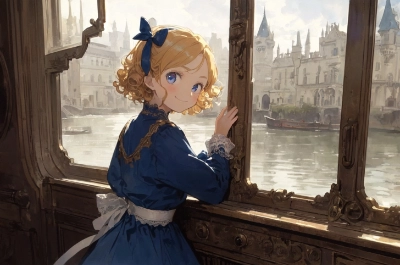 (((Masterpiece, highest quality))), (((thick line))), (((super sharp focus))), Night view, Scenery of a child looking out from a boat, Solo, River, Illuminated table Castle, Cantera, (1 girl (3 years old), blonde hair ((curly hair, side parting, short hair)), dark blue Alice band ribbon)), purple eyes (round and big eyes), open mouth. Smile ((small mouth)), dark blue dress ((long sleeves, white lace, no metal))), Rococo architecture, watercolor style, rainbow colors, steampunk, antique, fantasy