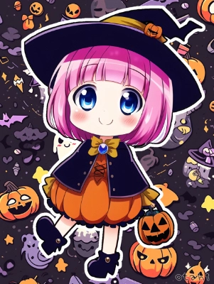 very aesthetic, best quality, absurdres, A confident young girl dressed as a stylish witch with a sparkling orange mask, holding a magical wand, smiles against the backdrop of a lively Halloween night, surrounded by the vibrant, lantern-lit cityscape.