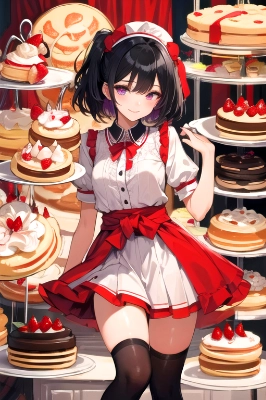 A masterpiece, high quality, super clear, super detailed, (((((handsome male, 30 years old))))), eyes are purple, slanted and cool, V-shaped eyebrows, body is strong and fearless. 8.5 heads, 185 cm tall, cool-colored short black hair down to the neck, (((bangs parted in 73))), smooth nose, facial muscles, throat, clothes: black vest, black tie, white shirt, butler, With a fearless smile, (((lots and lots of shortcakes))),