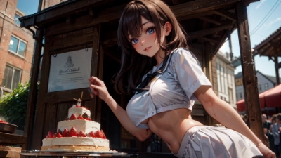 The setting takes place in the luxurious courtyard of a grand castle,where a beautiful princess is enjoying a slice of cake. In the background,a magnificent castle towers over the palace courtyard,adorned with a lavish garden and beautiful flowers in full bloom. The sunlight shines brightly,illuminating the entire scene.,