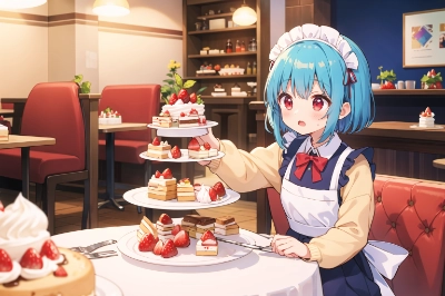 best quality, extremely detailed, anime, colorful, foreshortening, food focus, solo, maid, 1girl, blue hair, short hair, red eyes, open mouth, surprised, holding tray, maid headdress, long sleeve, skirt, frilled apron, (stumbling:1.2), (tripping:1.4), (strawberry shortcake:1.2), cake slice, strawberry, whipped cream, fork, tray, (flying cake:1.1), indoors, cafe, table, tablecloth, chair
