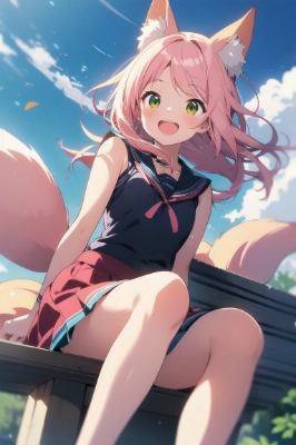 ((masterpiece, best quality)),[[from above]],cowboy shot,2girl,fox girls,swept bangs,black hair,hair ribon, extremely detailed, anime,looking up,smile,closed eyes,open mouth,(wind),shrine maiden clothes ,((confidence smile)),(autumn garden),,,