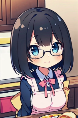 (best quality, masterpiece, ultra-detailed),1girl, Cooking in the Kitchen,(vegetable juice drink made from green leafy vegetables:1.3), (school uniform:1.2), glasses,black hair,bob cut, extremely beautiful detailed girl, smiling at viewer and a fine thing to say, (wearing an Pink apron:1.1), younger sister, oversized clothes, Cute slender face. (droopy eyes:1.3), round eyes, dull eyes, delicate and Beautiful hair,happy,baby face,(upper body:1),(looking at viewer:1.1),,,,,
