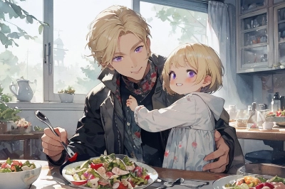(((Masterpiece, top quality)))), (((line becomes thicker))), father feeding his child, (1 boy ((40 years old)), blonde hair ((short hair, side parted)) , purple eyes, smiling, looking at the daughter, holding a spoon), (1 girl (2 years old), blonde ((short hair, parted on the side)), purple eyes ((looking at the table) ), round face, white dress ((baggy))), one plate (salad) on the table, mug, watercolor style