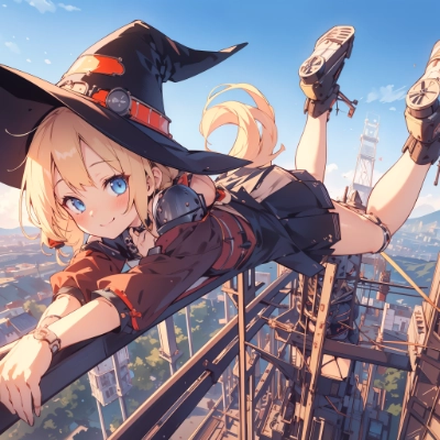 (black witch:1.2), witch hat, off shoulder, miniskirt, smile,