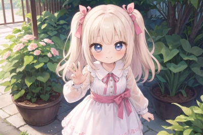 ((masterpiece)) (best quality) (beautiful detailed eyes) (ultra-detailed) (finely detail) (highres) 2girls ((((little female child)))) ((loli)) ((toddler)) two side up long blonde hair silver hair pink ribbon white dress lace-trimmed embroidery long sleeves floral garden embarrassed blush ((kiss french kiss)) ((hugging)) standing (((closed eyes))) yuri ((from side)) ((saliva drool)) [[blue eyes]] beautiful landscape scenery wide shot