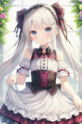 a photo of cartoon girl with purple hair wearing pink and blue eye make up, a blue dress and a blue hat with ribbon around the neck, holding a cone filled with ice cream, 1girl, solo, smile, food, ice cream cone, ice cream, long hair, ribbon, bangs, blue eyes, holding food, open mouth, day, :d, sky, looking at viewer, outdoors, bare shoulders, hair ribbon, holding, cloud, blue sky, brown hair, railing, blue shirt,