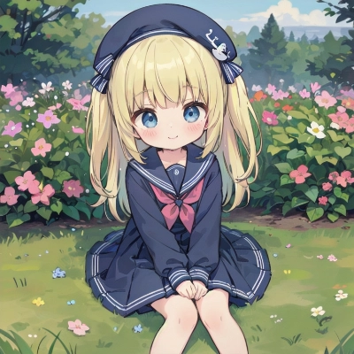 masterpiece, best quality, extremely detailed, anime, ((((little female child)))) ((loli)) ((toddler)) two side up long blonde hair pink ribbon white dress lace-trimmed embroidery see-through long sleeves pink sash floral garden embarrassed blush smile closed mouth standing blue eyes,