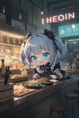 Japanese noodles,plateful,Isometric,jumbled picture,(best quality:1.2), masterpiece,(extremely detailed art:1.2),maximalism,elegant,ioluminescent,BREAK,Ultra Detailed (chibimaid),BREAK,(neon letters:1.2),(neon sign:1.2),blue,kawaii,smile,BREAK,face focus,,,