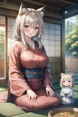 girl,RAW photo, best quality,realistic, photo-realistic, best quality ,masterpiece,an extremely delicate and beautiful, extremely detailed,2k wallpaper, Amazing, finely detail, 8k wallpaper,huge filesize , ultra-detailed, highres, extremely detailed,realistic, 8K, Ultra-High Definition, highest quality, ultra high resolution, (realistic:1.3), High quality texture, (2girls:1.1), kimono, shawl, cat ears, cat tail, medium breast, blond hair, pattern, (tan:1.2), wet hair, , wet skin, (teddy bear:1.4), daytime, <lora:flat2:-0.7> <lora:sanDka2:0.2>Japanese-style room, porch,japanese garden view:1.1),(tatami:1),,,,,,,,,,,,