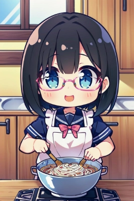 (best quality, masterpiece, ultra-detailed),1girl, Cooking in the Kitchen,(cooking with buckwheat noodles:1.3), (1plop of soba),(school uniform:1.2), glasses,black hair,bob cut, extremely beautiful detailed girl, smiling at viewer and a fine thing to say, (wearing an Pink apron:1.1), younger sister, oversized clothes, Cute slender face. (droopy eyes:1.3), round eyes, dull eyes, delicate and Beautiful hair,happy,baby face,(upper body:1),(looking at viewer:1.1),,,,