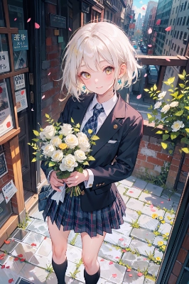 sitting, looking at viewer, open mouth, :d, blush, feet out of frame, holding bouquet, bouquet