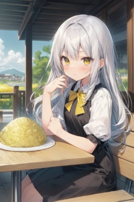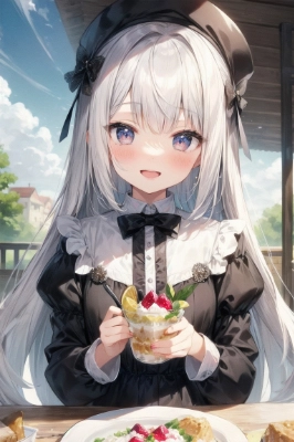 masterpiece, detailed face, ultra detailed, best quality, (illustration:1.2), 8k cg wallpaper, stunning art, beautiful hair, a cute girl, (10yo:1.1), small body, (silver long hair:1.1), gothic white onepiece dress, bowtie, happy smile, open mouth, (blush:1.2), sitting, across the table with big parfait on it, in open terrace, upper body, (parfait focus:1.2),