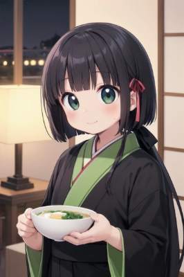 (((very longest hair))),black hair, smile, straight Hair,hair ribbon,mintgreen stripe,Black Eyes,flat chest,straight Across bangs,princess Cut, Very Long Sideburn,roundry Head,Droping eyes,cute,Meekness,Bob Cut,long back hair,12 years Old,loli, breakfast,Egg rice,Chair,table,Sunlight,Window,