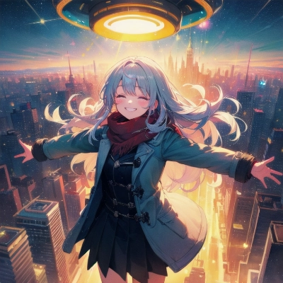 8k quality,masterpiece,colorful light particles,powder light,watercolor,pencil drawing,,1 girl,solo,silver hair,long hair,grin, duffel coat,skirt, Spreading arms wide open, UFO is flying,cowboy shot, Shadow, night,city, <lora:hairdetailer:0> <lora:saturation:1> ,,,,,