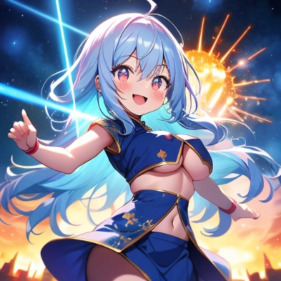 masterpiece, best quality, extremely detailed, anime, (UFO:1.4), (explosion:1.3), (laser beam:1.2), night, beautiful citylight landscape,,best quality,ultra detailed,4K,super fine illustration,highly detailed beautiful face and eyes,Cinematic lighting,cyan color scheme,cowboy shot,1girl,kawaii face,huge breasts,glamor,china dress in front of navel,midriff,navel cut out,glowing eyes,happy,long hair,floating hair,determined,dynamic pose,wind lift,magic circle,magic circle from hands,smile,magic,luminescence,(plasma:1.4),(electric current:1.4),Magical Attacks,night,wind,dark, flashlight,glowing,light-shadow symmetry,magic effect,glitter,fantasy,dynamic angle,(under boob:1.5)