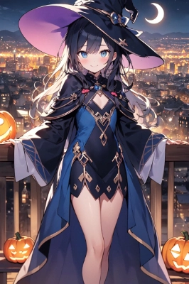 (Extraordinary, Best Beauty, New, Best Quality, Super Detailed 1.0, High Detailed, Detailed Background, Best Quality, High Detailed) Age: 16 years old, female, long hair, dark blue hair, light blue eyes, dark blue witch\'s hat, dark blue witch\'s robe, witch, exposed chest, (smiling expression), (absolute area), (flat chest), midnight, crescent moon, (Halloween cityscape).,
