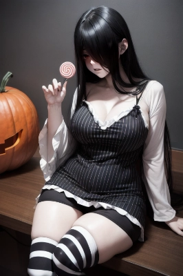 <lora:halloweenCutenessOverload2023:0.6>, halloween, halloween striped thighhighs, jack-o'-lantern, jack-o'-lantern bucket with candy, swirl lollipop