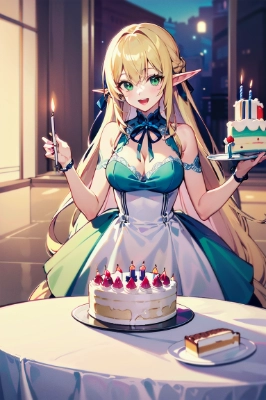 masterpiece, best quality, extremely detailed, anime, a solo,1 pretty woman, longhair, blonde hair, green eyes, elf, present day, beautiful breasts, ribbon, night,camp,lakeside ,bonfire,white Winter clothes,smile,eat barbecue meat, foreshortening,candles on the background,