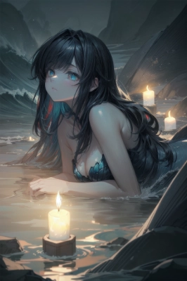 (masterpiece, best quality, extremely detailed, anime), (extremely detailed fine touch:1.2),1woman, black long hair, (detailed dark blue shinning eyes), (wearing a Japanese kimono), midnight, outdoor, (standing in front of the Japanese shrine), (holding a lit red colored candle her right hand), looking sad, mouth tightly closed, staring into the distance, (cowboy shot), , <lora:flat2:-0.7> <lora:hairdetailer:0.8> ,