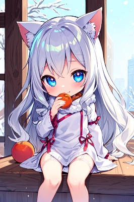 (mikan:1.2), (best quality), (ultra-detailed:1.2), (illustration), (short girl:1.2) (loli:1.2) (chibi:1.2) (toddlercon:1.1) (toddler body:1.1) (loli face:1.2) (4yo:1.1), (beautiful detailed eyes:1.1), (highlight in eyes:1.2), (long wavy hair:1.3), (gradient hair:1.3), (((tareme))), (pink head hair:1.1), skyblue tip hair, (cat ears:1.0), (nekomimi:1.0), happy, smile, (On a chilly winter day, a girl sits on a window sill, holding a mandarin close to her nose, taking in its zesty aroma. Outside, the world is painted in white, but her mandarin brings a touch of warmth and color. :1.3), (mikan:1.2), <lora:age_slider:0.7> <lora:toddler:0.7> (embroidery lace detailed lingerie:1.2)