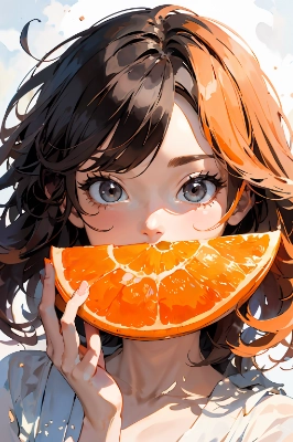 A girl holding a (large tangerine:1.3).