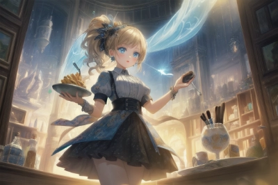 girl in[many-Colour] kneeing [sky-pattern-print]-[fantasy rubber.-fashion] [rubber. Accessories around] makeup ,puffy_short_sleeves[fork, pork paintbrush ,French-fries ,flying-pan,many-pleat .pierced-earring diamond ,powder-puff ,] [rubber. magic], in [fantasy Outdoors] , impressive ornament wonderful delicate infinity maximum quality picture in perfect detail-decoration cool ultimate sophisticated attractive perfect detail ultimate fascination best vivid absurdly clearly excellent intricate-pattern complicated cute beautiful light ultimate rare perfect CG-art illustration