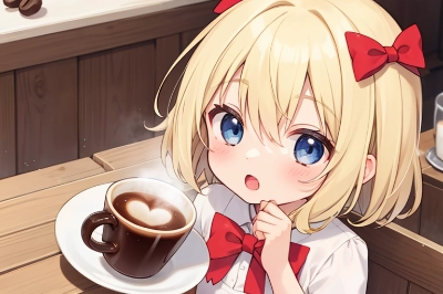 loli,blond hair,short hair,hair bow,red bow,blue eyes,pajamas,Create a comical anime-style image of a girl with short blonde hair in cozy pajamas, standing in a living room on a lazy holiday. She\'s holding a mug cup in one hand with a sleepy, half-lidded expression. Her other hand is rubbing an eye, and there\'s a humorous mismatched sock on one foot peeking out. The room is warmly lit and inviting, suggesting a quiet, slow morning.