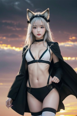 masterpiece, best quality, extremely detailed, anime, girl, skirtvery close to viewer, Facing the lens, sleeping, smooth, Mature, man and wife, 20 years old, long black hair, short hair with long locks, long bangs, eyes visible through hair, beautiful and detailed loong tail, twin drills, white and silver hair, colorful hair, long hair flowing with the wind, huge ahoge, pretty face, full-face blush, furrowed brow, detailed beautiful eyes, wolf ears, parted lips, slim claws, small breast with flower, stomach, thighhighs, detailed blue eyes, wet skin, stone accessory, Mechanical armor headdress, mask, sailor collar, cloak, crystal, white clothes, suspenders, black panties, brown footwear, The skirt sways with the wind, cropped torso, pig tails, complex pattern cloth, orange Clothes, golden sky, Fire cloud, altocumulus, Exquisite Blood, pink neon lights, extremely detailed, highres,,,