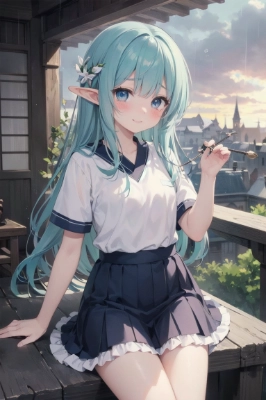 masterpiece, best quality, extremely detailed, anime, girl, skirt , frill, frills, girl, wet hair, ahoge, longhair, short sleeve, mini skirt, blue eyes, maid, elf, angel, lolibitch, succubus, brat, ojou-sama, princess, fantasy, wing, spring, morning, flower, sweating, blushing, happy, smile, smiling, laughing, flying,