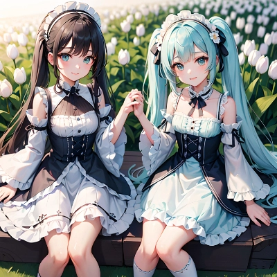 1girl, solo, long hair, looking at viewer, blush, smile, bangs, blue eyes, hair ornament, long sleeves, dress, twintails, sitting, closed mouth, flower, white hair, grey hair, outdoors, frills, shoes, socks, puffy sleeves, hair flower, wide sleeves, black footwear, apron, black dress, maid, kneehighs, maid headdress, grass, white socks, white apron, maid apron, blue flower, frilled apron, field,