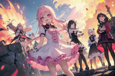 masterpiece, best quality, extremely detailed, anime, girl, small breast, small hip, pink long messy hair, pink eyes, red rim eyeglass , ((yellow casual dress)), smile ,An odd eye black cat walking through the gap in the front door, from above <lora:boldline:-1> ,