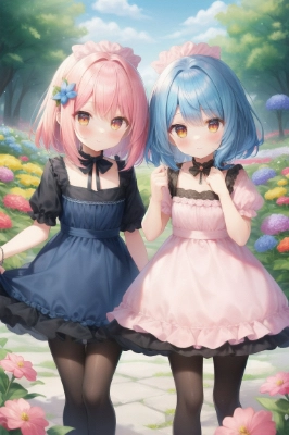 ((masterpiece, best quality, absurdres)), (pale colors:1.2), Clarity, (black tights:1.2), slim body, (short bob:1.4), blue hair, (no inner color:1.4), (no underlayer:1.2), flat chest, dark yellow eyes, white shorts, (short pants over tights:1.4), many flower, smile, top of head, door, <lora:asb-CH1:-1> <lora:asb-CH2:-1>,,
