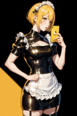 classical latex maid looking up at space from a hill overlooking a lake, masterpiece, ultra detailed, detailed beautiful skin, detailed beautiful face, petite figure, detailed skin texture, detailed hair, blue silver bob, glowing eyes,