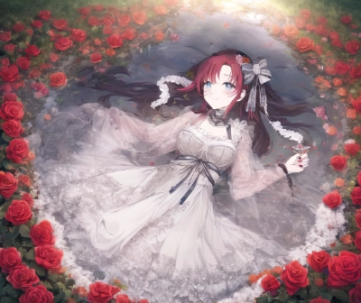 masterpiece, best quality, extremely detailed, anime , turtle, tortoise mammy_girl lying rose_printin graceful_mikohakama lace. frill. ribbon.bow embroidery. manicure.rose_accessory. rosetree fortune-telling_effect in river,