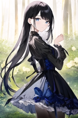 masterpiece, best quality, Draw a girl in a Victorian style dress in her new outfit with a cute miniskirt. The girl's hairstyle is long, black, side-parted, and partly pinned up. The girl wears a black dress decorated with a blue ribbon. Her miniskirt is red plaid and she wears black tights. For the background, draw an image of an unrealistic place like a mysterious forest with lots of trees and flowers.., with blush cheeks, official art, {{ultra-detailed}}, {{high resolution}}, dynamic fuzziness, colorful, cowboy shot, underwear, beautiful detailed hair, beautiful detailed eyes,