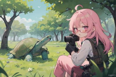 masterpiece, best quality, extremely detailed, anime, (1 white cup noodle), (1 plastic fork), (grabbing a cup noodle:1.3), (grabbing a fork:1.3), (outdoor camping:1.4) , (1girl, pink eyes, pink long messy hair, red rim eyeglass:1.4) , laughing , (yellow outdoor wear:1.3), long pants , long socks, green climbing shoes, sitting on log, from above,