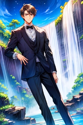 Masterpiece, high quality, super clear, super detailed, ((((( male handsome man, adult age 30, ))))), purple eyes, cool with suspended eyes, V-shaped eyebrows, body strong and fearless 8.5 head tall, 185cm, cold well-groomed black short hair to neck, (((bangs split in thirds))), slender nose, expression lines, throat, Clothes: black suit, black tie, (((waterfall))), night sky<lora:flat2:-0.35> <lora:hairdetailer:0.85> ,,,
