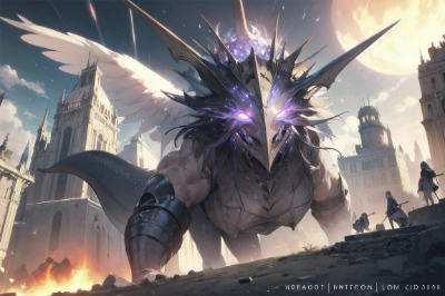 A giant octopus, a giant robot cat with a gatling, fighting, a medieval European fantasy world, a destroyed city, a huge crimson Saturn in the sky, 1000 little people running away, explosions, the apocalypse, from afar. view of,