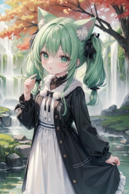 masterpiece, best quality, (chibi girl, silver hair), fox ears, (calm waterfall), sliding <lora:flat2:-0.35> <lora:hairdetailer:0.25> ,