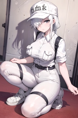 (((on one knee))),(masterpiece, best quality:1.2), <lora:cellsatwork_whitebloodcell-09:1>, cowboy shot, solo, 1girl, white blood cell, colored skin, white skin, expressionless, looking at viewer, arms behind head, white hair, hair over one eye, baseball cap, black eyes, (blood on clothes:1.5), white uniform, unbuttoned, white pants, cleavage