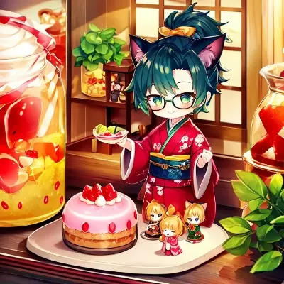 (((1boy))) darkgreenhair medium-ponytail round-glasses kimono pants cat-ear strawberry cherry chibi SD NENDOROID smile (((solo))) (( in a glass-jar)) big-caramel-pudding full-body sweets-shop in a doll-house cat caramel-pudding-wooddish kawaii