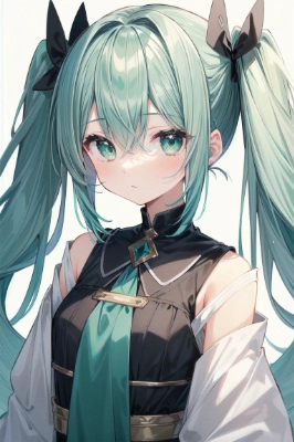 (Hatune Miku:1.5)emerald green hair long wavy hair twintails.hairs between eyes,dark green eyes.anime,(masterpiece, top quality, best quality, official art, beautiful and aesthetic:1.2), (1girl), upper body,extreme detailed,(fractal art:1.3),colorful,highest detailed,