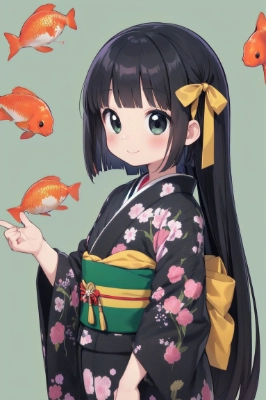 (((very longest hair))),black hair, smile, straight Hair,hair ribbon,mintgreen stripe,Black Eyes,flat chest,straight Across bangs,princess Cut, Very Long Sideburn,roundry Head,Droping eyes,cute,Meekness,Bob Cut,long back hair,12 years Old,loli, holding goldfish in a Vinyl bag,